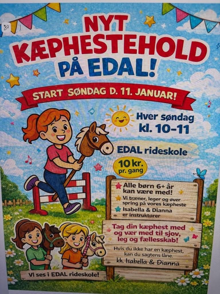 Du skal selv medbringe kæphest, have tøj til at bevæge dig i og tøj du gerne må blive beskidt i. Forældre kan sidde i rytterstuen eller gå en tur i området, mens der er undervisning.